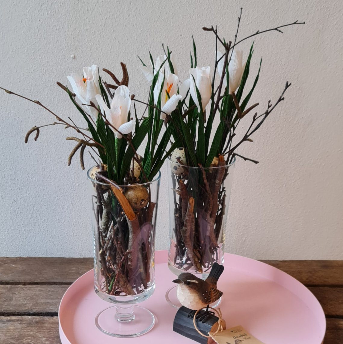 3 stk. fine krokus I hvid. Her er de vist i en lille borddekoration, men har mange andre anvendelses muligheder.