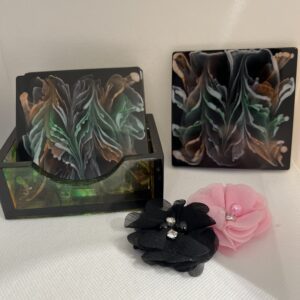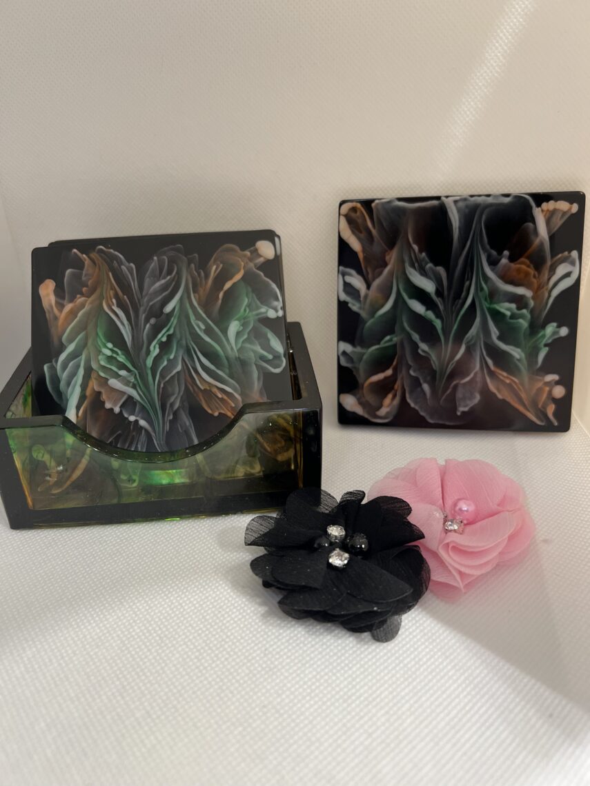 Et firkantet coaster-sæt med blomstereffekt kombinerer funktionalitet og elegance. Det unikke design med fine blomsterdetaljer beskytter dine overflader og tilføjer samtidig et dekorativt touch til din indretning. Perfekt som gave eller som et stilfuldt element i dit eget hjem.