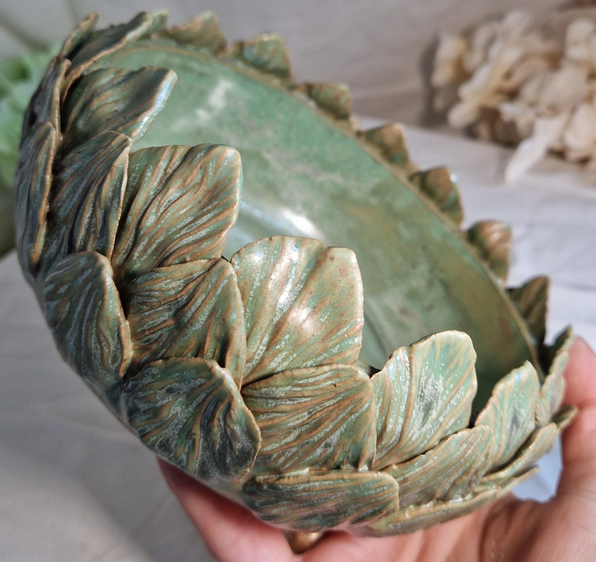 Smuk skål i lysegrønne nuancer, der giver et friskt og let udtryk.