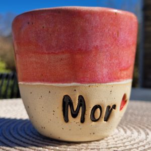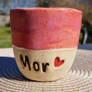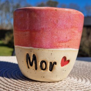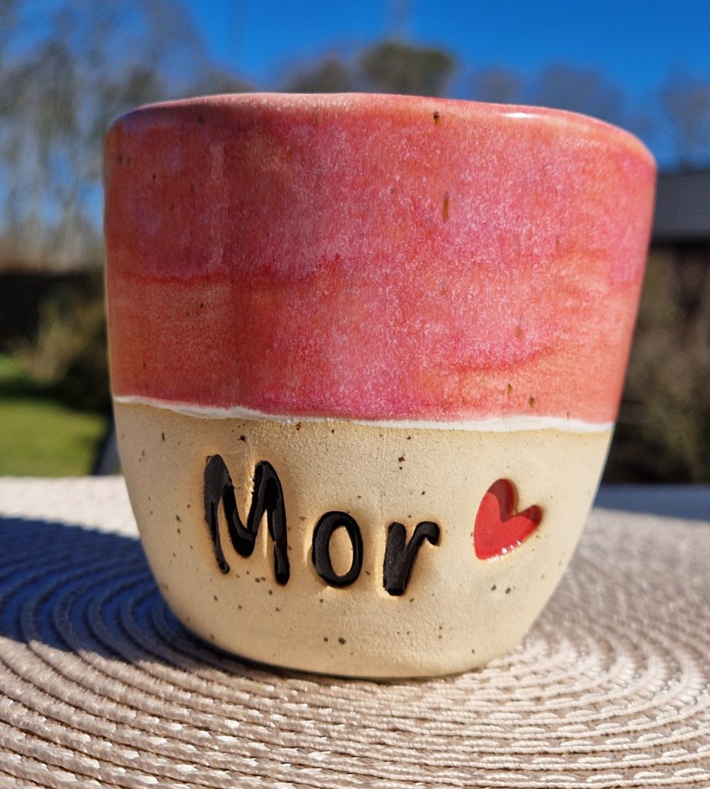 Koppen er dekoreret med teksten “mor”, som gør den til en personlig og kærlig favorit i hverdagen.