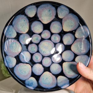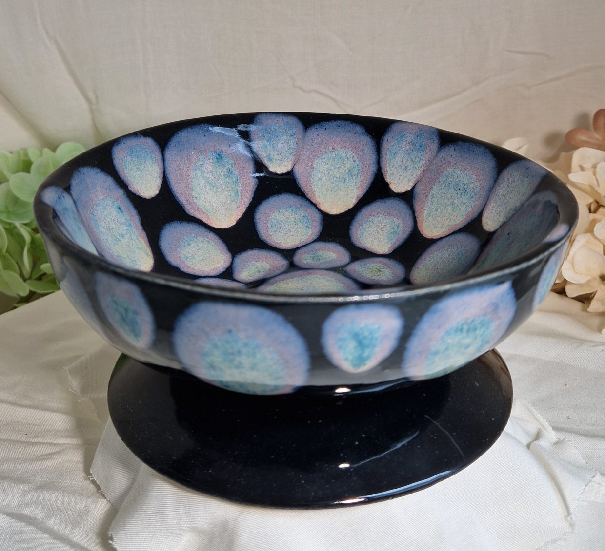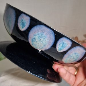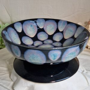 Elegant sort skål på fod med et smukt blåt mønster, der skaber et iøjnefaldende og dekorativt udtryk.