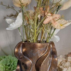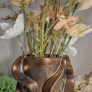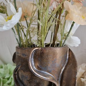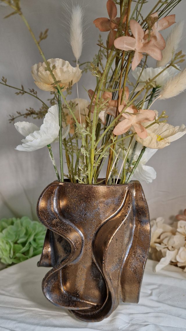 Elegant vase med organiske former og en smuk bronze-gylden glasur, der fanger lyset og skinner varmt i solens stråler.