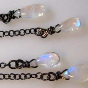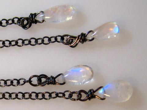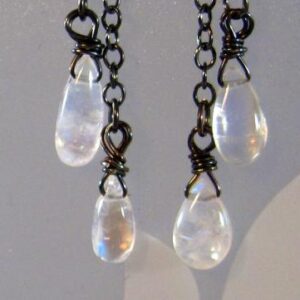 Oxyderede ørestikker i sølv med vedhæng af smukke månesten med et vidunderligt blåligt skær. Ørestikkerne måler i alt ca. 70 mm, månestenene måler ca. 10 mm.