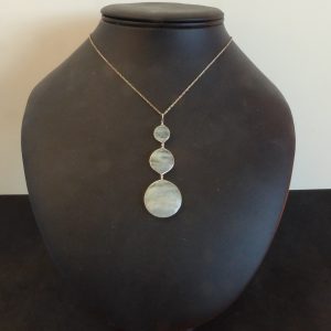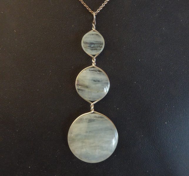 Tre akvamariner, hvor man næsten kan se havets bølger. De indeholder helt transparente områder, så de fremtræder meget forskelligt afhængig af underlaget. De kan roteres i fatningerne, så linjerne i stenene behøver ikke at være vandrette. Øreringene varenummer 373 passer fin til.