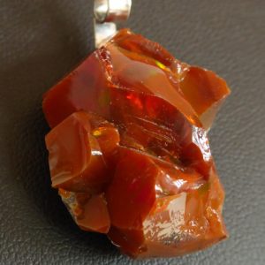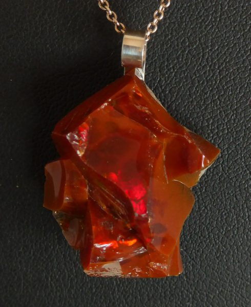 Da jeg købte råstenen fik jeg at vide, at den var vanskelig at slibe. Der gik da heller ikke lang slibetid, før en jeg sad med ikke én sten, men med 4 stykker. Brudfladerne har dog en skønhed i sig selv, så den rå flade med de fantastiske reflekser i mest rødt, men også grønt og blåt, har her fået lov til at stå, så det er kun bagsiden, der er slebet. Stenen måler 2½ cm i højden. Den skal behandles meget forsigtigt.