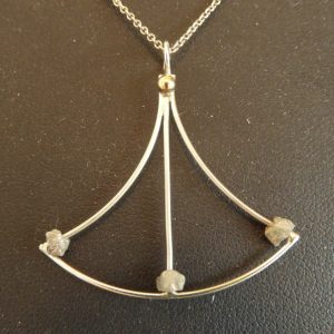 Tre lysegrå rådiamanter ophængt luftigt og spicet op med en lille guldkugle. Smykket måler 4 cm i bredden. Passer til øresmykkerne varenummer 310
