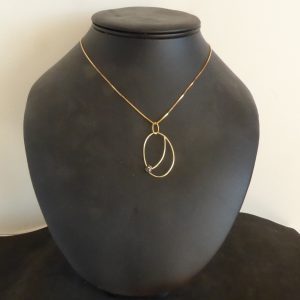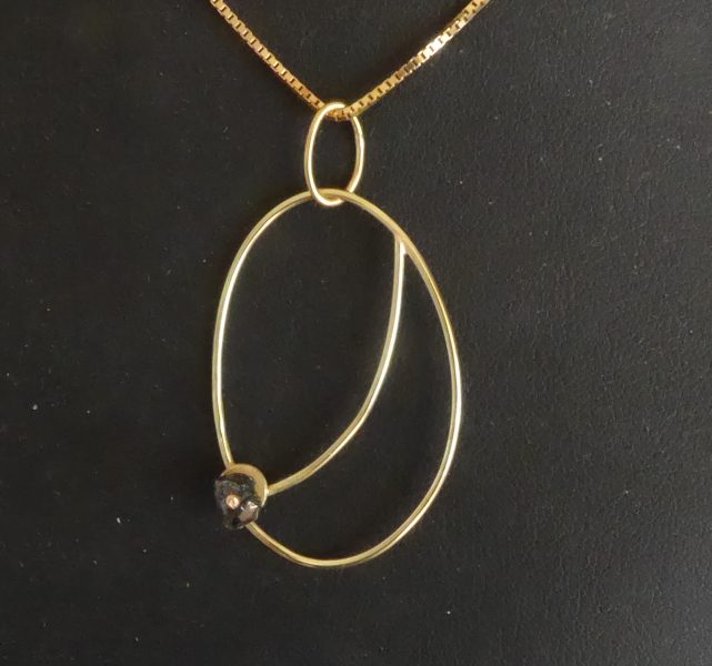 Et elliptisk halsvedhæng med en sort rådiamant ophængt i en ellipse