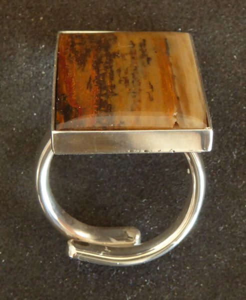 Fingerring med et stort stykke forstenet træ. Stenen måler 30 mm * 17mm. Ringen er åben, og kan tilpasses op til omkring 60 mm. Den er skåret af samme råsten som ørestikkerne nr. 288 og halsvedhænget nr. 286.