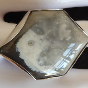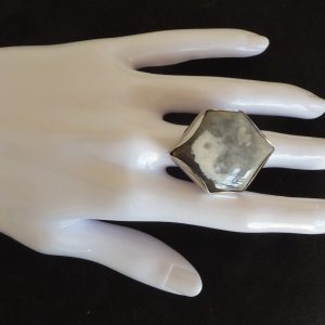 Her er et lidt stort stykke flint – 4 cm * 3 cm monteret på en åben ring med mindste mål 54 mm. Der er en fantastisk tegning af fossiler, hvor man kan finde mange ansigter. Hvor mange kan du finde?