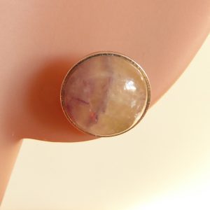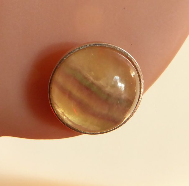 Flourit er en lidt sart sten, men som halsvedhæng og ørestikker lever den ikke livet så farligt. Denne sten har sarte farver. Den er skåret af samme råsten som halsvedhænget varenummer 320.