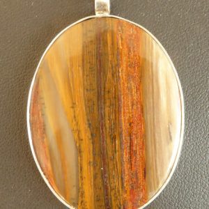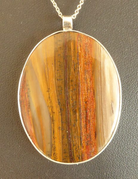 Halsvedhæng af forstenet træ. Den er skåret af samme råsten som øreringene nr.288 og fingerringen nr. 287. Stenen måler 4 * 3 cm