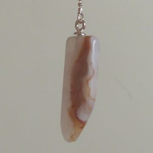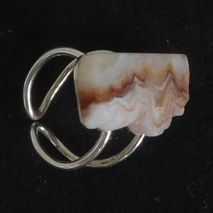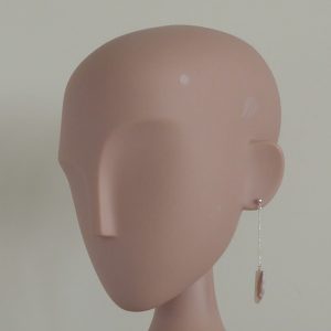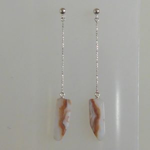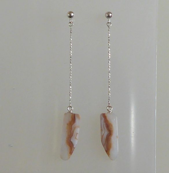 Et stykke planslebet kalcedon fra Rødovre (stenmessen i Rødovrehallen) er her blevet til 2 øreringe. Er skåret af samme sten som fingerringen varenummer 425.
