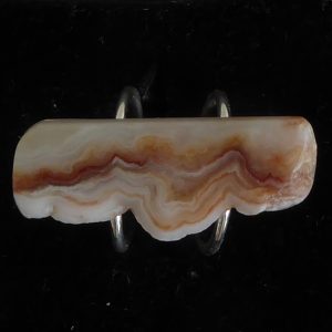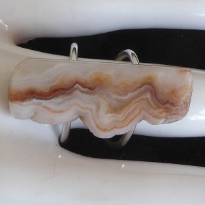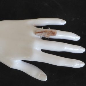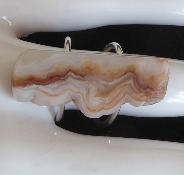 Et stykke planslebet kalcedon fra Rødovre (stenmessen i Rødovrehallen) med noget rå kant bevaret er monteret på en åben ring. Er skåret af samme sten som øreringene varenummer 426.
