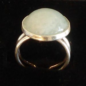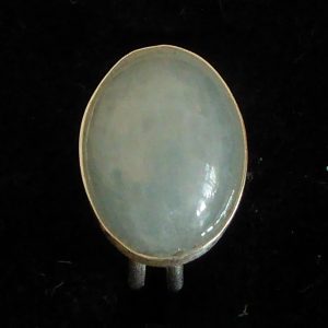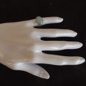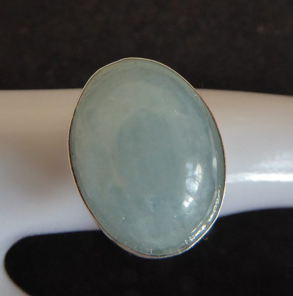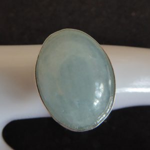 En lillefingerring med en akvamarin. Stenen måler 10 * 14 mm. Ringen er åben og kan øges lidt.