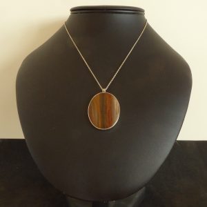 To ulige lange stykker forstenet træ, her hængende i 4 cm lange kuglekæder. Den ene sten måler godt 2½cm, og den anden knap 2 cm.