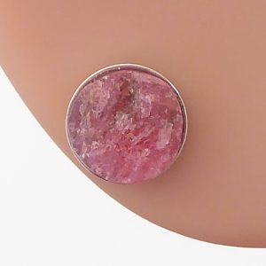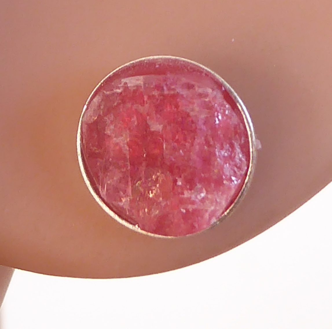 - Denne rå krystalinske rhodonit har meget fine reflekser. Den spalter nemt, men det lykkedes at lave disse to øreringe. De er lavet af den samme råsten som vedhænget nr. 423.