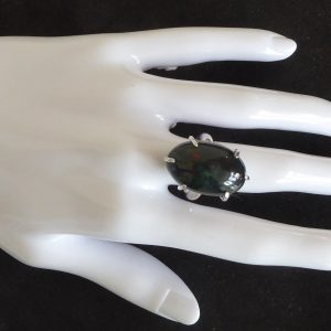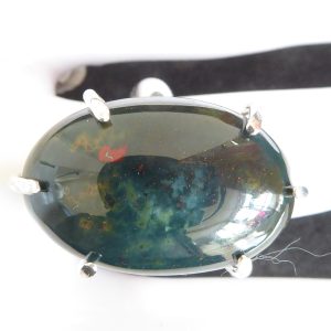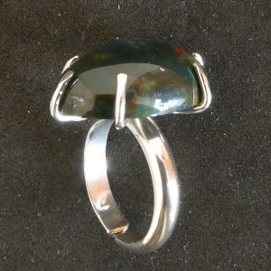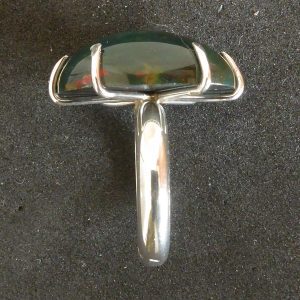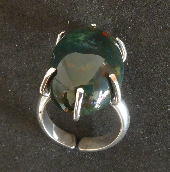 En stor heliotropring. Stenen måler 2½ * 1½ cm. Den er skåret af samme råsten som vedhænget 343. Ringen er åben og kan justeres lidt.