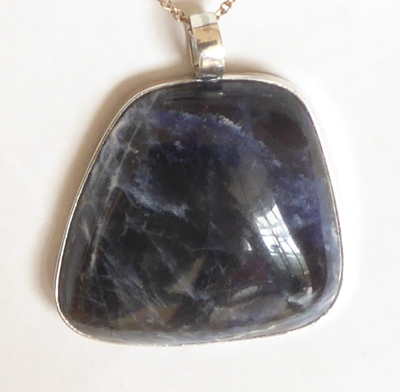Denne sodalit i fri form indeholder blå, sorte og hvide elementer.