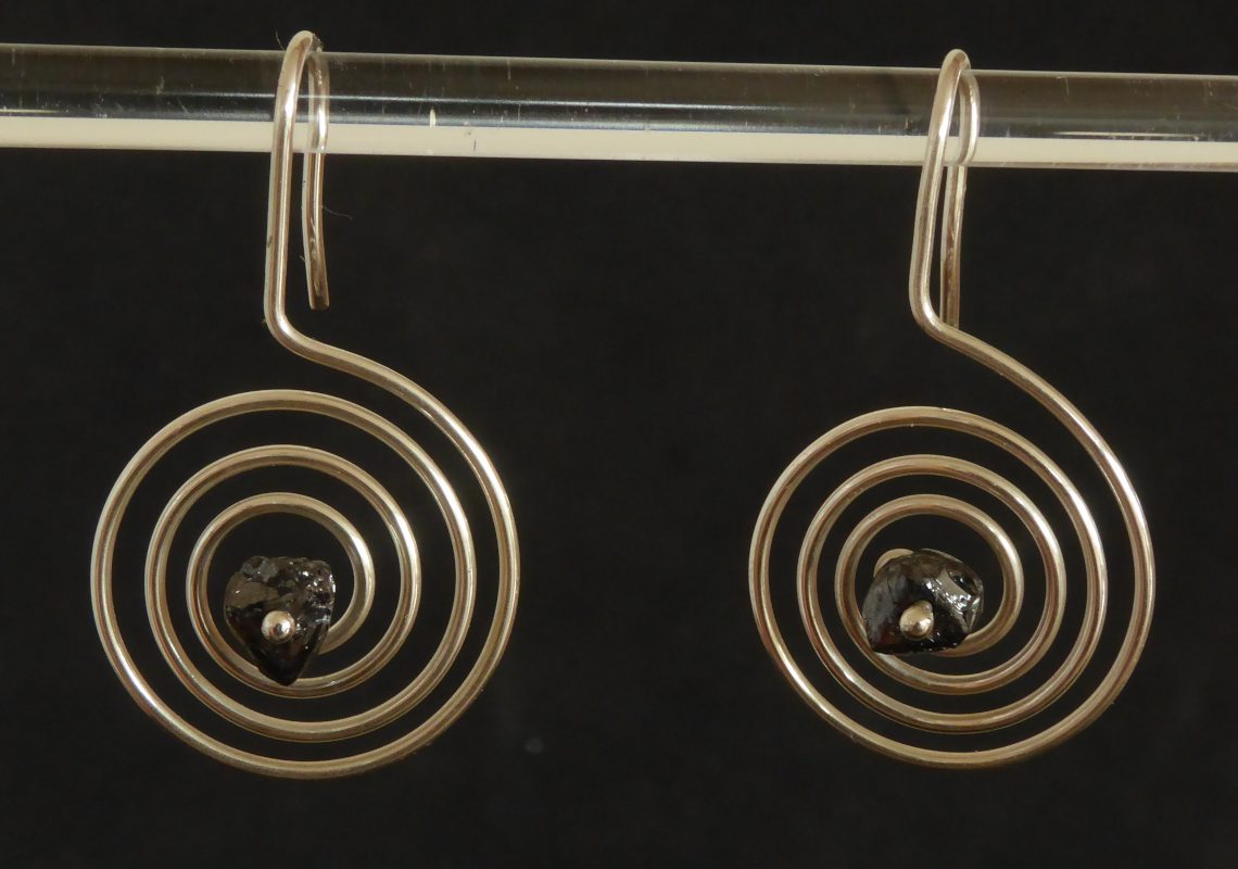To øresmykker med rådiamanter på Argentium Sterlingsølv. Diameteren på spiralerne er 21 mm. Øresmykkerne passer til halsvedhænget varenummer 289.