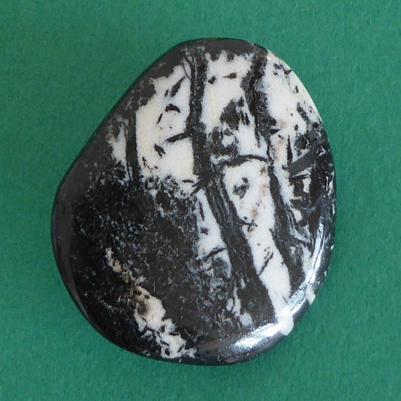 Råstenen til denne broche er fra Fingruvann, Bergslagen, Sverige. Jeg samlede den op, fordi den skreg polér mig. Google foreslår, at det er en zebrajaspis, men det er det ikke. Det sorte ligner et amfibolmineral. Højden er 4 cm og bredden 3.5 cm