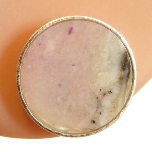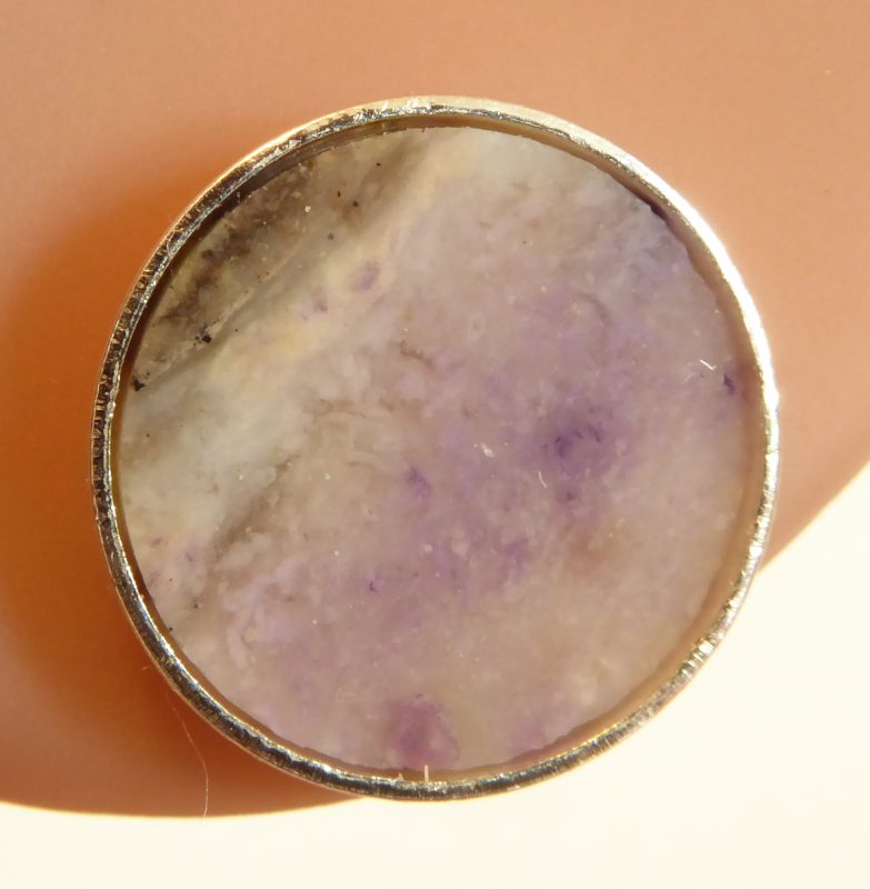 Formentlig agat i violete, hvide og grå farver, planslebet og monteret på en fatning på 12 mm.
