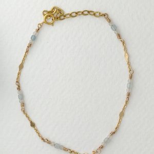 De sarte blå-toner møder varmen fra forgyldt messingkæde og doublé tråd, som elegant fletter sig gennem designet.