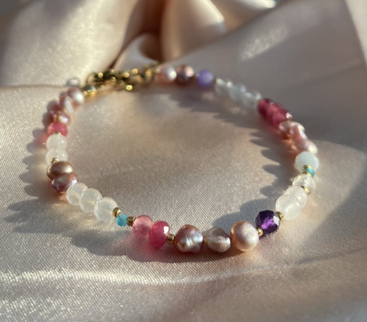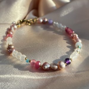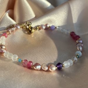 Dette armbånd er et af mine favoritter! Jeg har lavet det med et mix af alle mine favoritter og besat dem hele vejen rundt. Armbåndet består af ferskvandsperler, små facetslebne apatit, kvarts, en ametyst og en akvamarin. Smukt!