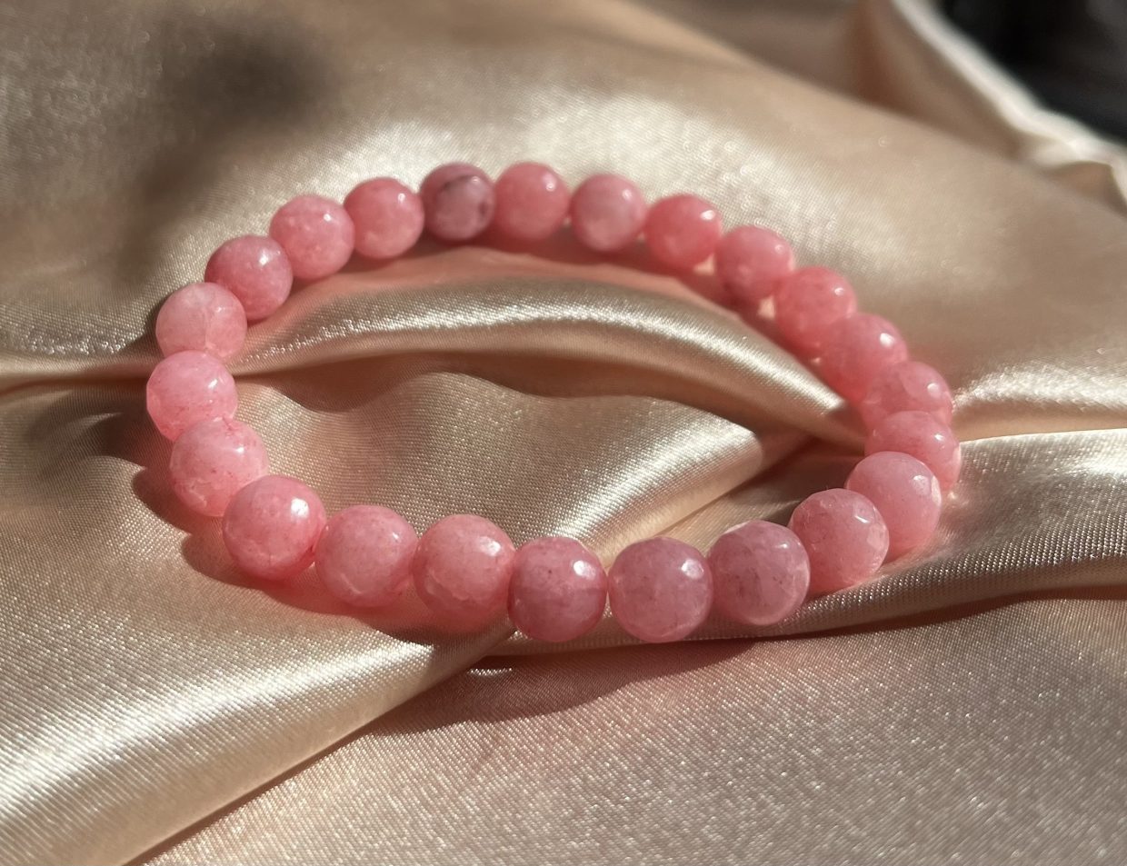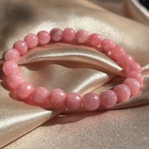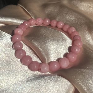 Armbåndet er lavet med pink jade i ca. 8mm og er facetslebet.
