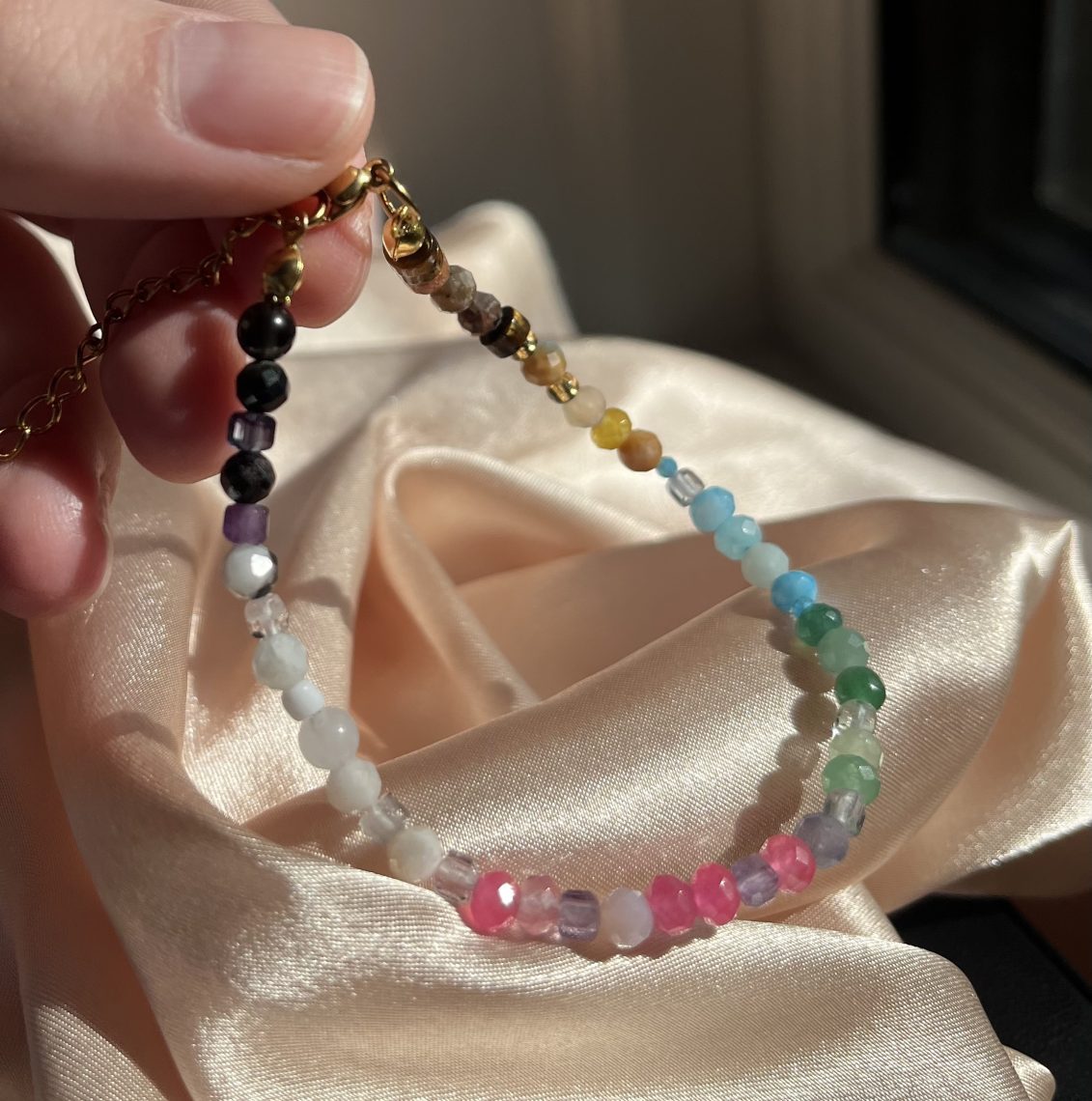 Farverigt og livligt med alle regnbuensfarver i forskellige nuancer og former! Der er facetslebne firkanter, rondeller og runde former, der er med til at give liv til armbåndet!