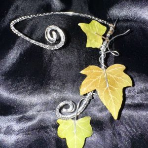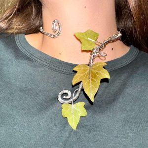 Det er en justerbar håndlavet choker med ægte vedbendblade. De er dækket med uv resin, så de er holdbare og ikke visner. Det er omkring 10 timers arbejde. (pas på at presse på bladene, selvom de er holdbare, er stadig et naturligt materiale). Man kan også prøve at bruge det som en armcuff, for trådet er fleksibelt nok:)