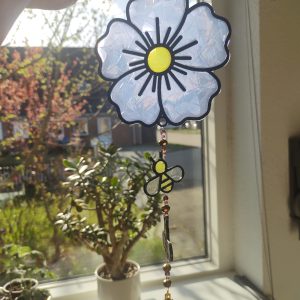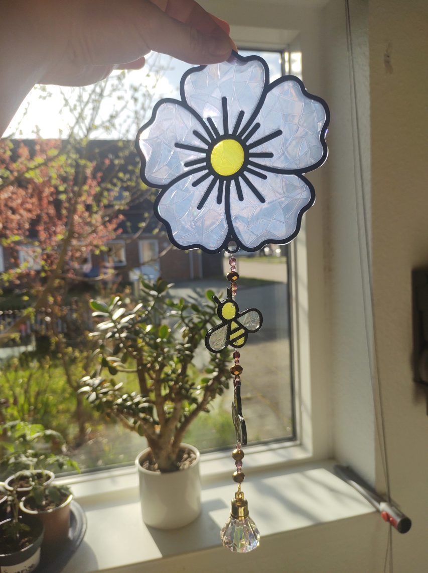 Denne smukke blomst med bier vil helst sikkert give dig et smil på læben, når den kaster solens stråler rundt i lokalet som små regnbuer.